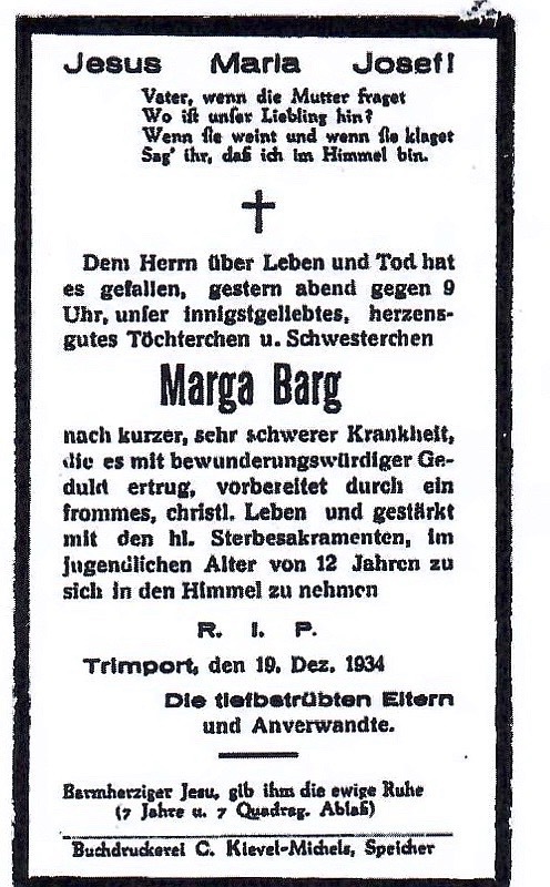 Am 21.3. wurden infolge der Bemühungen des hochw. Herrn Pastor Poetz aus Idenheim 14 Kinder aus der Großstadt Saarbrücken in der Pfarrei zur Erholung, Pflege und Kräftigung untergebracht. Vier davon (3 Knaben und ein Mädchen) fanden hier im Orte Unterkunft. Am 8.4. wurden weitere Kinder aus Saarbrücken nach Idenheim gebracht und einzelnen Familien zugeteilt. Diesmal erhielt Trimport wiederum 4 Pfleglinge (1 Knabe und 3 Mädchen). Somit ist die Kinderzahl in der hiesigen Schule bis auf 66 gestiegen.